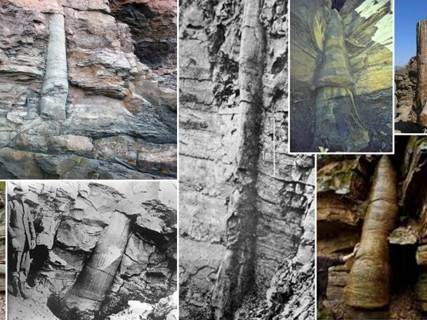 Polystrate trees (upright fossilized trunks pushing through many rock layers) are also called polystrate fossils. These specimens indicate rapid burial of the tree in mud slides and molten rock layers over a very short period of time and not over millions of years. These upright tree trunks are found all around the world. Some are found in rock layers while others are found in coal seams in The King Billy pines, Celery Top pines, and in southern hemisphere coal. There are also polystrate tree trunks in the Yellowstone fossilized forests and in Nova Scotia and many other places throughout the world.